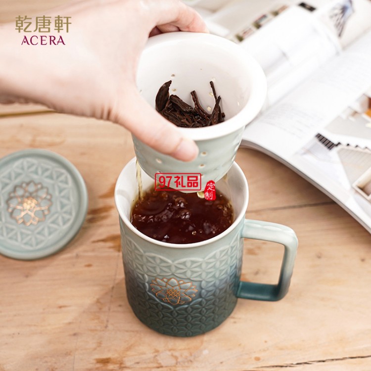 商務(wù)辦公杯帶蓋乾唐軒活瓷生命之花描金高杯送客戶隨手禮品460ml