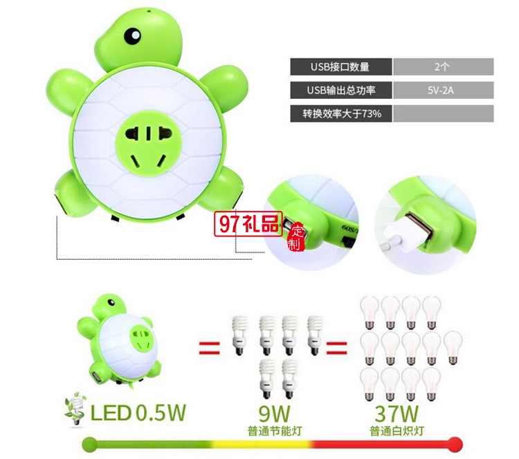 【產(chǎn)品名稱】: 充電神龜功能夜燈 【產(chǎn)品款式】: 白光 黃光 【包裝材質(zhì)】:彩盒 【產(chǎn)品材質(zhì)】:ABS+PC 【產(chǎn)品適用】:臥室 客廳 戶外 【產(chǎn)品尺寸】:120×103×52(mm) 【產(chǎn)品功能】:電源插座*雙usb充電插孔*聲光控 【產(chǎn)品凈重/毛重】:220g/370g 【燈光光源】:LED光源 【燈具功率】:0.6W 【輸入電壓】:AC100~240v~50/60Hz 【裝箱資料】:48個(gè)/箱 【箱規(guī)尺寸】:56.5*43*34.5CM 【箱凈重/毛重】:17KG/18KG