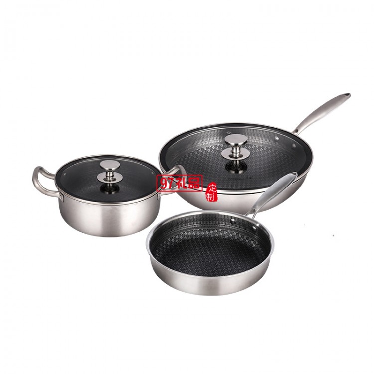 加工定制304不銹鋼鍋具三件套禮品套裝加厚平底鍋不粘鍋燃?xì)馔ㄓ?