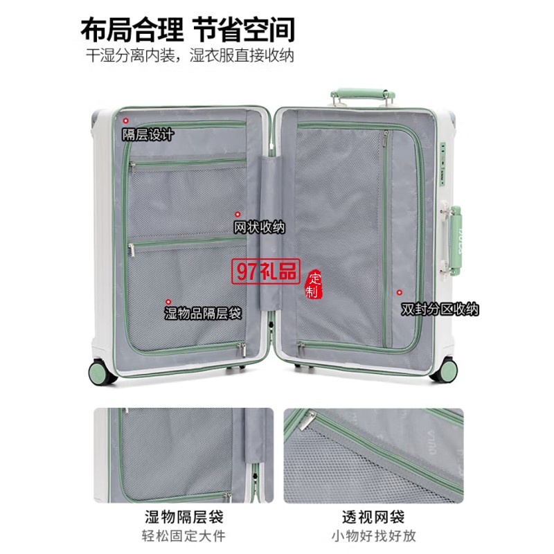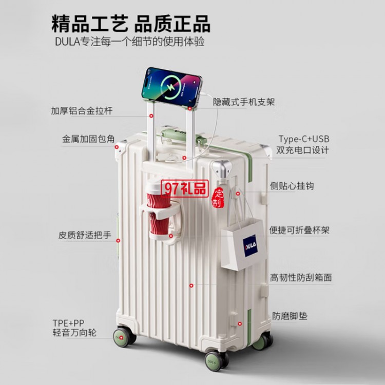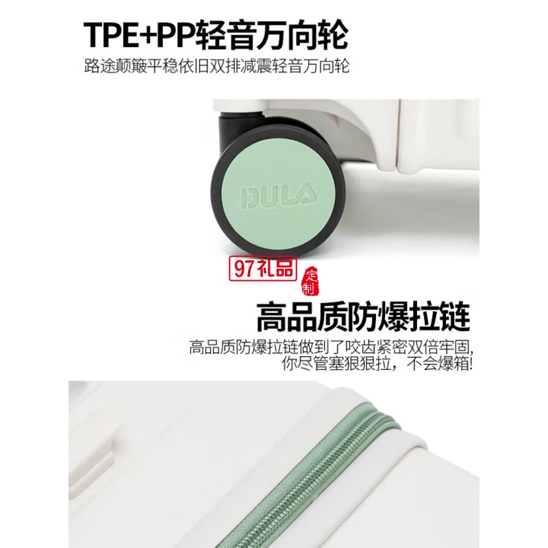 ④側(cè)貼心掛鉤 ⑤TPE+PP輕音萬向輪 ⑥加厚鋁合金拉桿