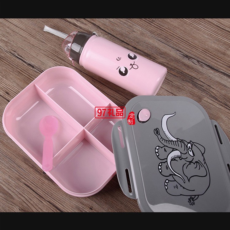 塑料學(xué)生長(zhǎng)方形分格飯盒帶400ml水壺套裝 卡通套裝飯盒帶手提袋