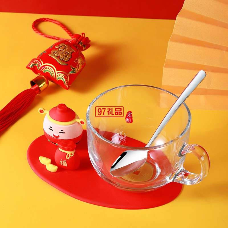 產品特點: 杯子玻璃+PVC杯墊,攪拌勺不銹鋼材質。獨特的財神爺和福袋設計,寓意招財進寶。原創(chuàng)設計,圖案可定制。